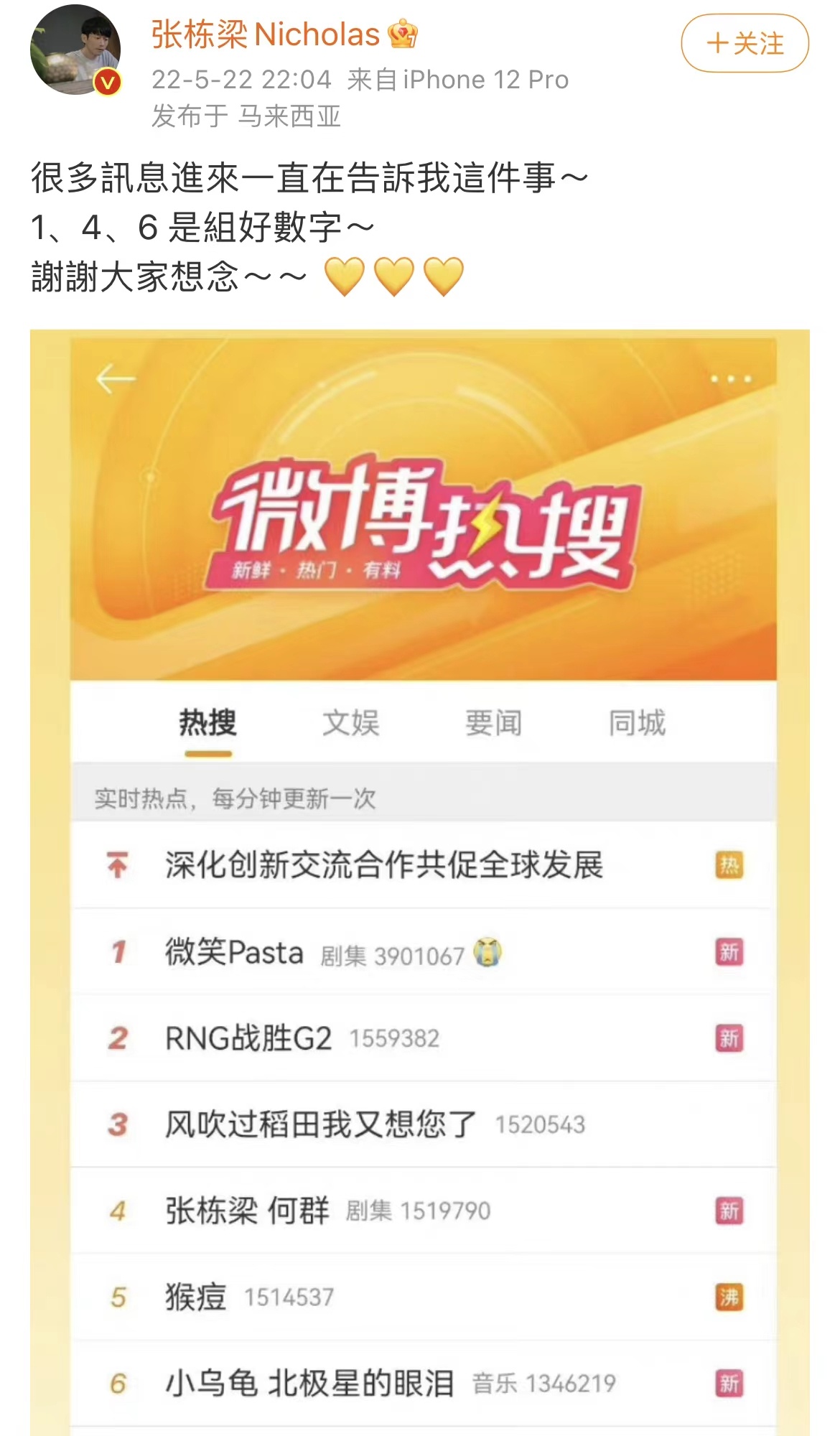 5月22日,马来西亚歌手张栋梁发微博感谢大家的想念,并配上《微笑Pasta》相关的3个词条登上热搜的截图。