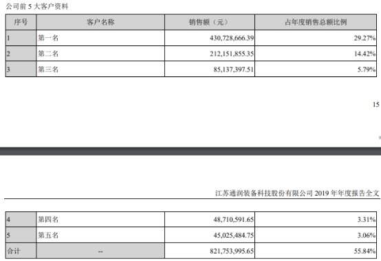 通润装备2019年年报披露的前5大客户资料显示,通润装备对第三名、第四名客户的销售额分别为8513.74万元、4871.06万元。常润股份招股书披露的2019年向通润装备的采购额在通润装备的第三、四两大客户之间。