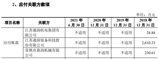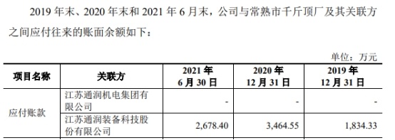常润股份招股书显示,截至2018年底、2019年底、2020年底,常润股份对通润装备的应付账款分别为2,610.23万元、1,834.33万元、3,464.55万元。