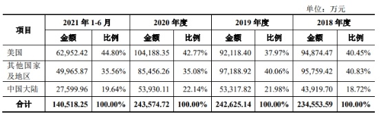报告期内,常润股份主营业务中境外销售收入金额分别为190,633.89万元、189,307.32万元、189,644.60万元和112,918.29万元,其占主营业务收入的比例分别为81.28%、78.02%、77.86%和80.36%。公司境外客户主要分布于美国、欧洲等国家和地区。其中4成左右的主营业务收入来自美国。2018年度、2019年度、2020年度及2021年1-6月,常润股份出口美国的销售收入分别为94,874.47万元、92,118.40万元、104,188.35万元和62,952.42万元,占主营业务收入比例分别为40.45%、37.97%、42.77%和44.80%。