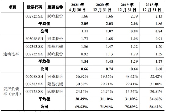常润股份的毛利率在2020年及去年上半年连降。2018年-2020年及2021年1-6月,常润股份的综合毛利率分别为20.45%、21.79%、18.50%、15.40%。可比上市公司综合毛利率平均值分别为19.44%、20.08%、14.55%、12.18%。