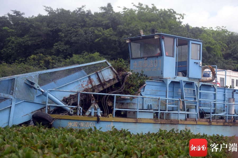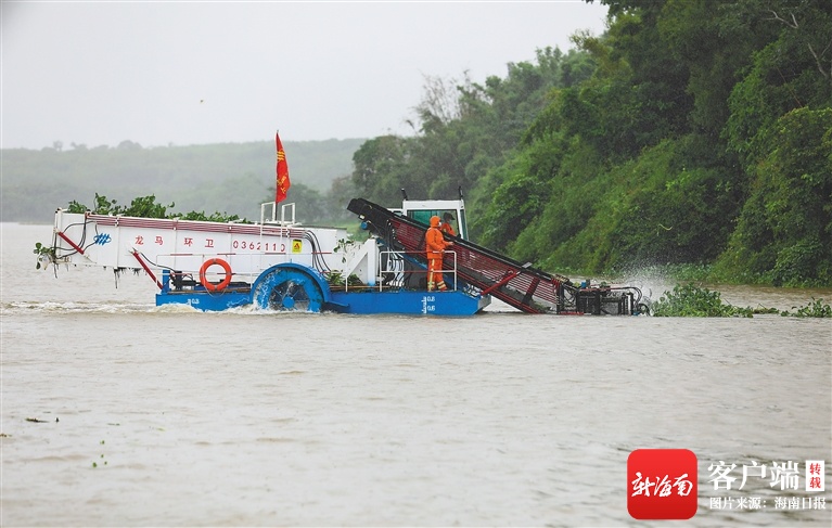环卫工人操作割捞船清理水浮莲。海南日报记者 李天平 摄