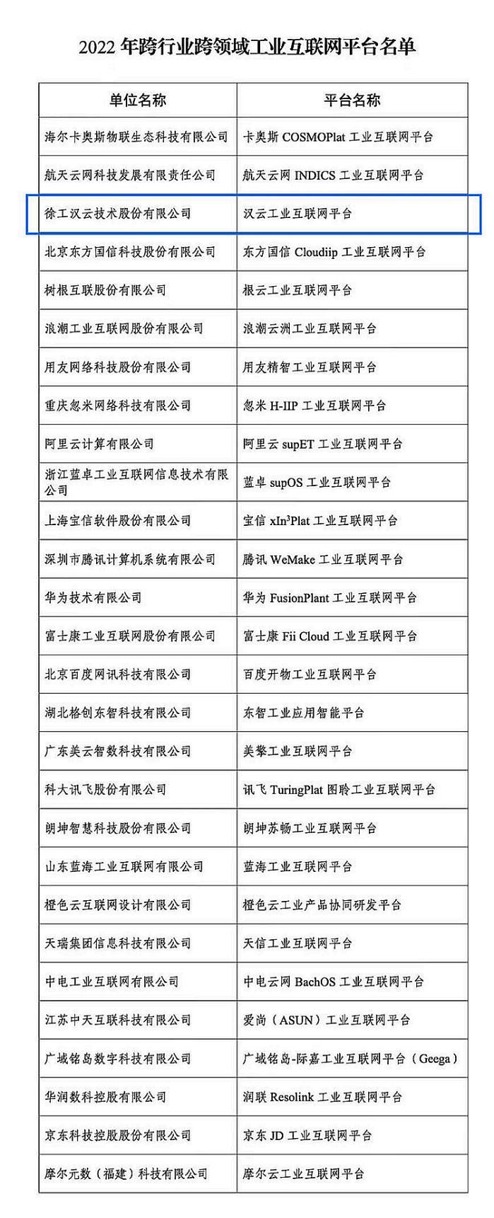近日,工信部公示了备受业内关注的2022年跨行业跨领域工业互联网平台动态调整结果清单,徐工汉云位列第三,并实现连续四年排名跃升,行业领先地位得到进一步巩固,充分表明汉云工业互联网平台的能力和价值不但通过了市场验证,更得到国家的认可。