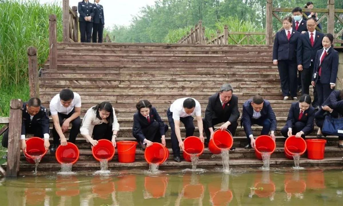 沙湖湿地公园东荆河边,一尾尾鱼苗顺着水流,欢快地游向远方。5月20日,仙桃沙湖国家湿地公园生态环境司法保护基地揭牌,现场仙桃法院、仙桃渔政船检港监管理局联合执行非法捕捞水产品一案的执行活动,开展生态修复增殖放流幼鱼6万余苗。