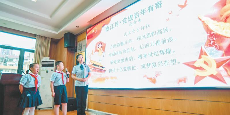 排演红色课本剧、诵读红色家书、寻访红色教育基地、争做校园志愿者……江汉区北湖小学挖掘各学科资源,发挥传统项目特色,引导学生在实践中学习党史,在生动的主题活动中给孩子种下红色的种子,传承红色基因。