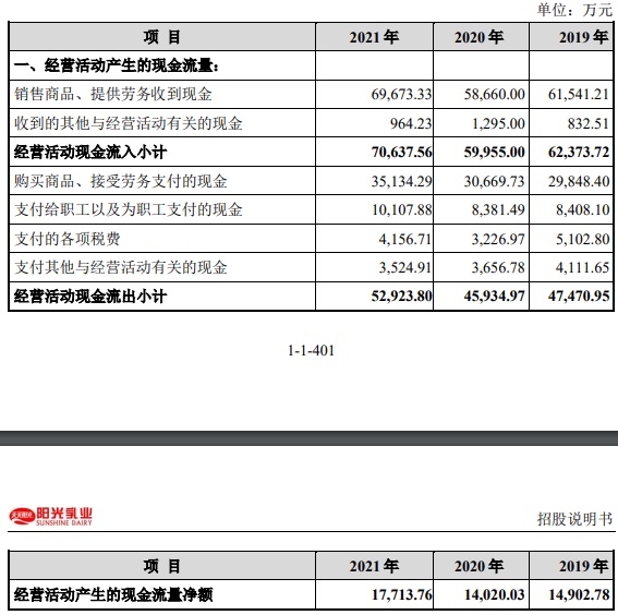 2019年-2021年,阳光乳业营业收入分别为5.43亿元、5.23亿元、6.31亿元,销售商品、提供劳务收到现金分别为6.15亿元、5.87亿元、6.97亿元,净利润分别为1.04亿元、1.03亿元、1.34亿元,经营活动产生的现金流量净额分别为1.49亿元、1.40亿元、1.77亿元。