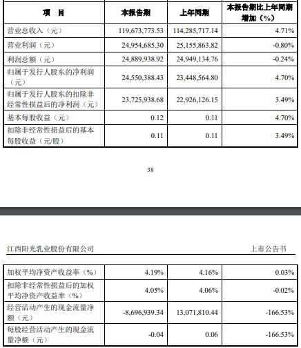 2022年1-3月,阳光乳业实现营业收入1.20亿元,同比增长4.71%;归属于发行人股东的净利润2455.04万元,同比增长4.70%;经营活动产生的现金流量净额为-869.69万元,上年同期为1307.18万元,同比下降166.53%%。