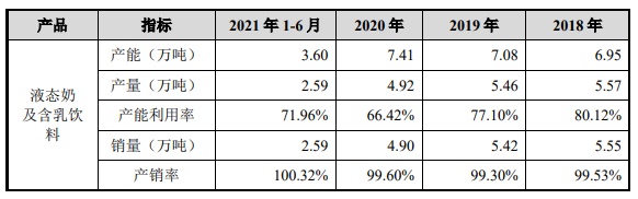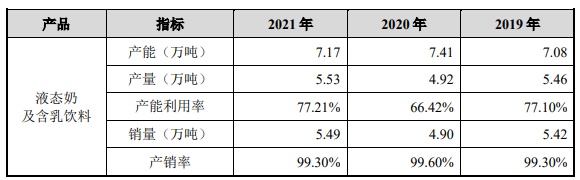 2018-2021年,阳光乳业产能利用率分别为80.12%、77.10%、66.42%、77.21%,产销率分别为99.53%、99.30%、99.60%、99.30%。