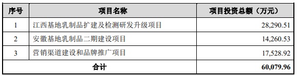 阳光乳业2022年5月6日披露的招股书显示,公司本次募资中28290.51万元将用于“江西基地乳制品扩建及检测研发升级项目”,14260.53万元用于“安徽基地乳制品二期建设项目”、17528.92万元用于“营销渠道建设和品牌推广项目”。