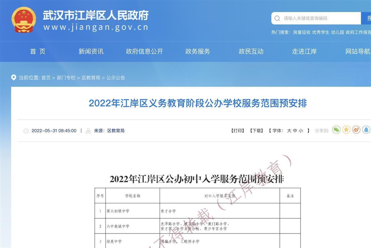 5月31日,武汉市江岸区公布2022年公办初中、小学入学服务范围预安排。