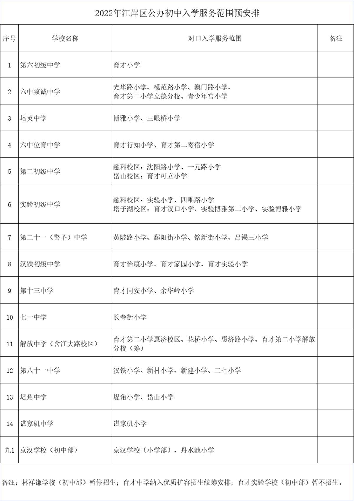 附:2022年江岸区公办小学、初中入学服务范围预安排