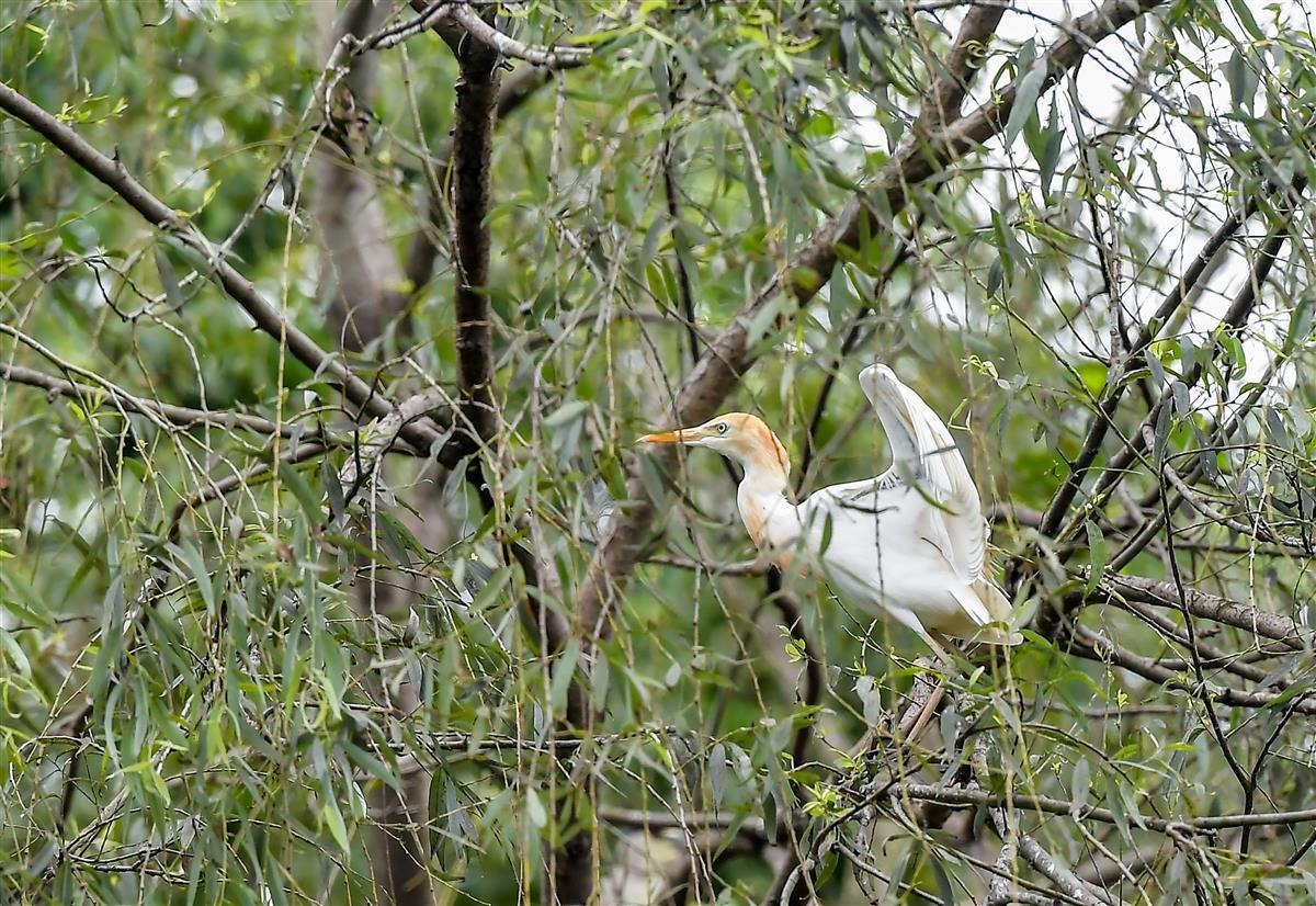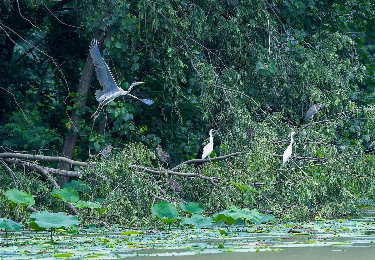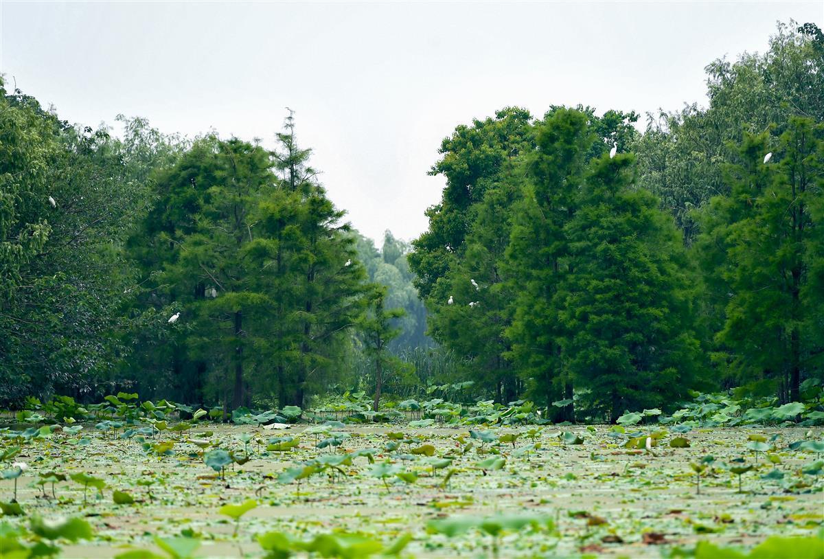 灰褐色的苍鹭在亭亭玉立的池杉上筑巢,洁白的白鹭在波光潋滟的湖面翻飞。