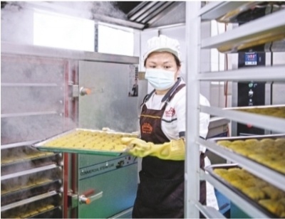“汪玉霞”的生产车间里,一位师傅将制作好的绿豆糕半成品送上货架,准备下一步的蒸制。