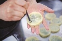 收到面料,5位糕点师傅开始包饼,在案板撒上粉,将面团来回揉搓、折叠成64层,以确保成饼后能形成一层层脆皮;里面的馅料也有讲究,糖稀、桂花、金橘的配比要恰到好处,才能入口甜爽不沾牙。包好,一位师傅用毛笔蘸糖稀在上面写上玉字,粘上芝麻,饼坯就做成了。