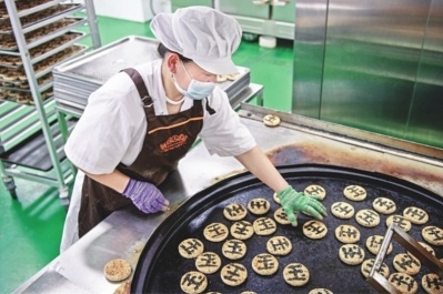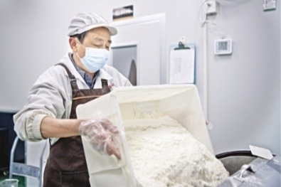 口罩、白衣、白帽、围裙,一一穿戴好,消毒进入配料区,将面粉倒入桶中,边搅边加水和匀,半小时后,他揪起一团扯开,至薄如蝉翼而不破,这才满意地将这桶做酥饼的面料发到下个工序。