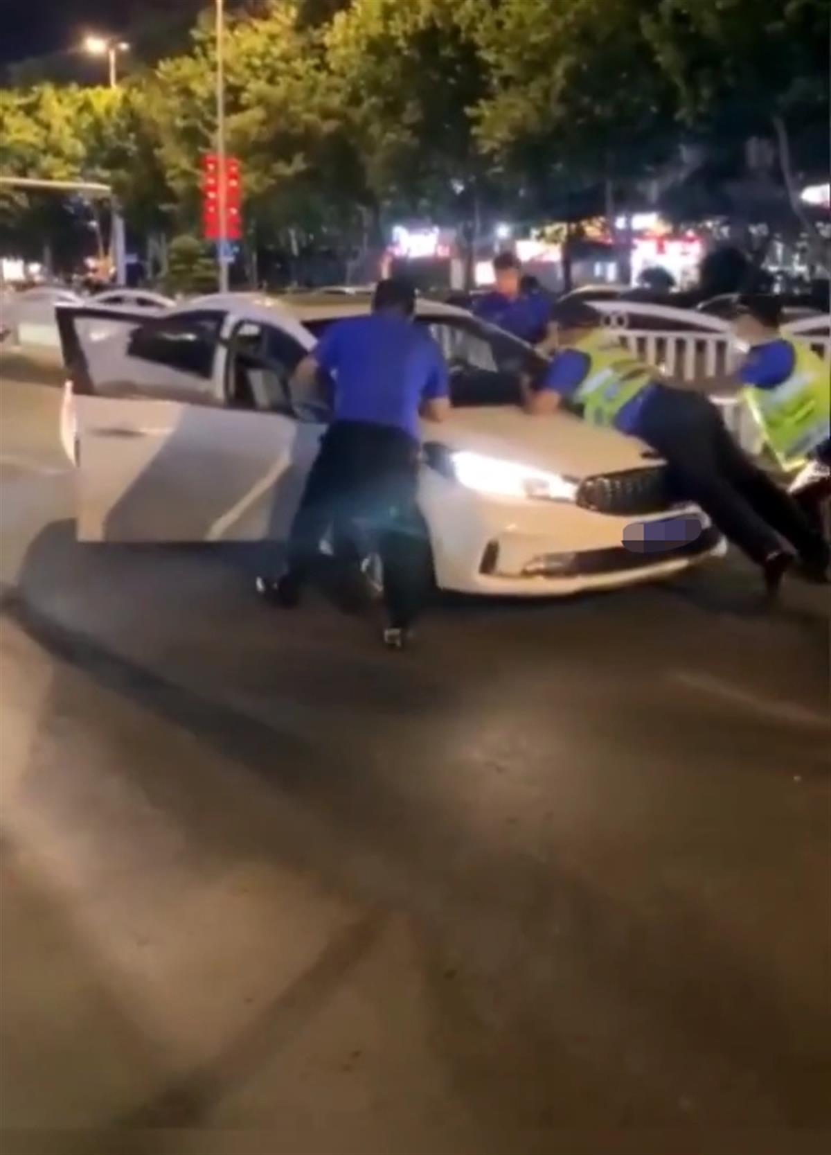 现场视频显示,在一个夜市门口,几个穿着执法制服的工作人员在跟一辆白色轿车的司机交涉。突然司机开始倒车,执法人员打开车门让其停车,引擎盖上还趴着一位执法人员。但司机不听劝阻,倒车后接着加油门往前开,该名执法人员双脚离地,趴在车上。