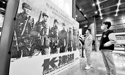 2021年10月,两名年轻人在北京一家影院观看电影《长津湖》的海报。新华社发