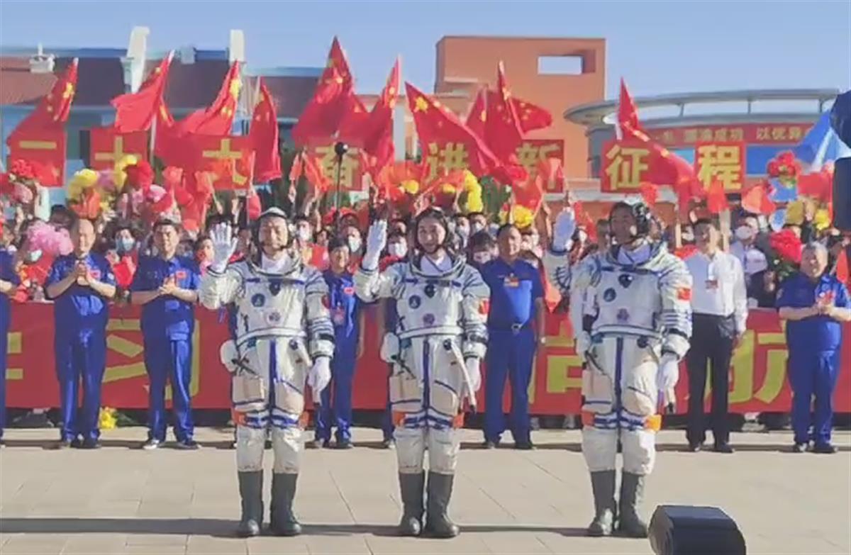 “出发!”李尚福下达命令,陈冬、刘洋、蔡旭哲3名航天员领命出征。