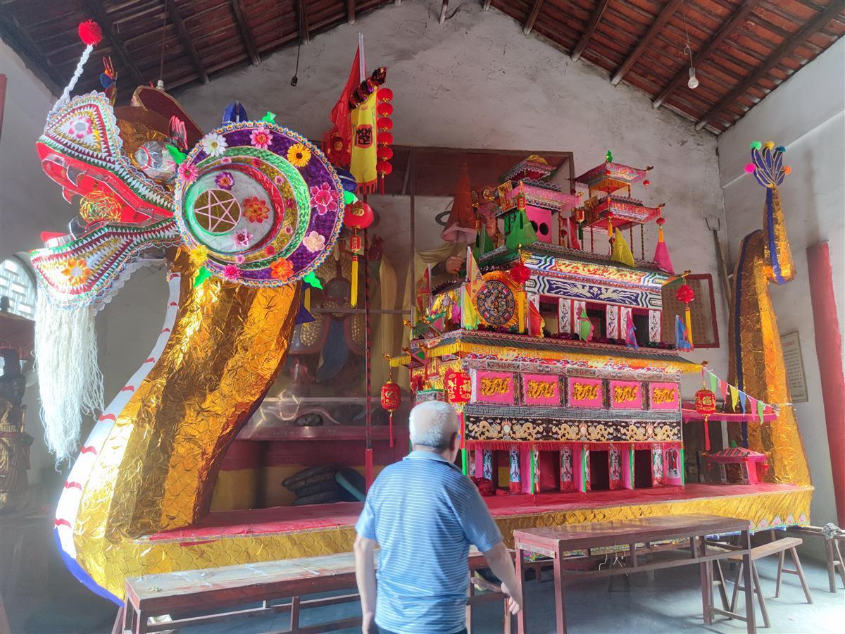 一条7米长的“金龙”口含彩球,威风凛凛;七十二神像各居其位,栩栩如生……6月4日,记者在湖北省鄂州市泽林镇兴隆寺看到,一条长7米、高4米多的旱龙舟船身已制作完成,75岁的刘桂生正在为船上的72神像上色。