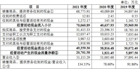 2017年至2021年,皓泽电子经营活动产生的现金流量净额分别为546.99万元、-2,071.56万元、5,897.50万元、1,821.45万元和20,701.58万元,净现比分别为0.18、-0.70、1.15、0.22和2.97;销售商品、提供劳务收到的现金分别为16,517.63万元、15,560.43万元、34,807.64万元、40,089.89万元和68,775.91万元,占营业收入比例分别为82.61%、53.33%、91.86%、78.60%和134.55%。