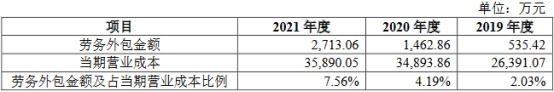 2018年至2021年,皓泽电子劳务外包金额分别为454.25万元、535.42万元、1,462.86万元和2,713.06万元,占当期营业成本比例分别为2.20%、2.03%、4.19%和7.56%。