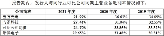 2018年至2021年,同行业可比上市公司主营业务毛利率平均值分别为37.72%、33.32%、33.85%和24.70%。