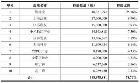 小米长江产业和OPPO广东位列帝奥微前十大股东。本次发行前,小米长江产业持有帝奥微14,193,818股,持股比例7.50%,为帝奥微第四大股东;OPPO广东持有帝奥微8,190,000股,持股比例4.33%,为帝奥微第七大股东。