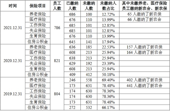 2018年至2021年,该公司未缴养老、医疗保险员工缴纳新农保人数分别为434人、402人、157人和65人,未缴养老、医疗保险员工缴纳新农合人数分别为525人、441人、164人和66人。