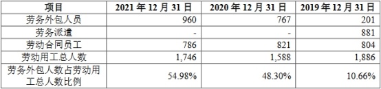 2018年至2021年各期末,皓泽电子劳务外包人员分别为75人、201人、767人和960人,占劳动用工总人数比例分别为6.26%、10.66%、48.30%和54.98%。