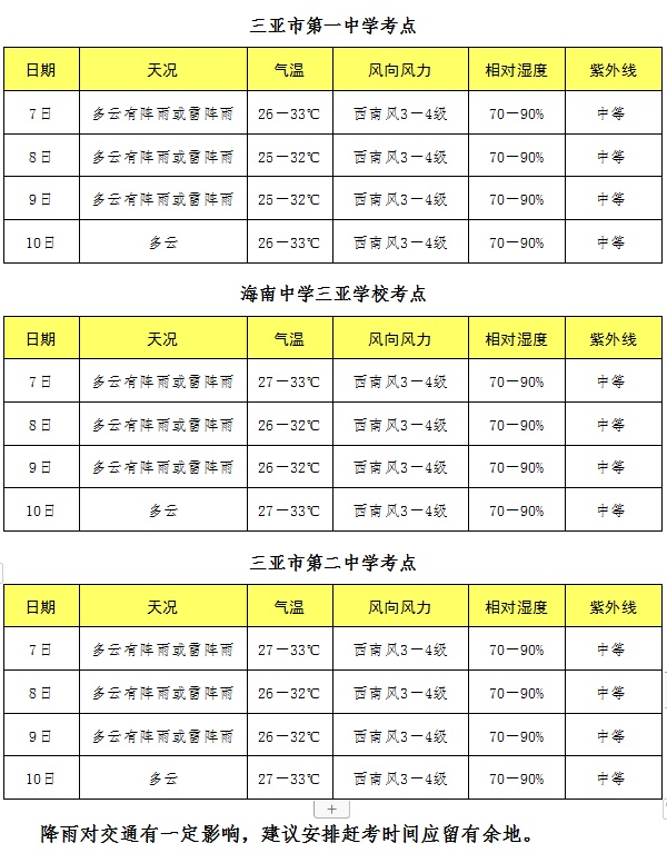 三亚市气象部门预计,高考期间(6月7日-10日)受切变线影响,三亚全市多云有阵雨或雷阵雨,降水主要出现在夜间到上午,其中8日局部有大雨,对高考出行将有不利影响,建议安排赶考时间应留有余地。
