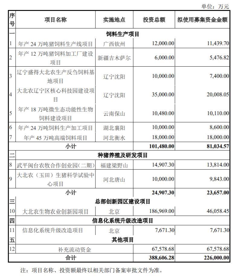 种猪养殖及研发项目,投资总额24,907.30万元,拟使用募集资金金额23,657.00万元,将分别用于武平闽台农牧合作创业园(二期)、大北农(玉田)生猪科学试验中心项目。