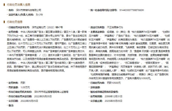 依据《中华人民共和国广告法》 第五十八条第一款、《中华人民共和国广告法》第十七条规定,深圳市市场监督管理局南山监管局于2022年5月5日决定对深圳市荣格科技有限公司罚款10500元。