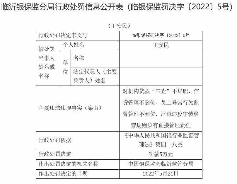 临沂银保监分局行政处罚信息公开表(临银保监罚决字〔2022〕5号)显示,王安民对机构贷款“三查”不尽职、信贷管理不到位、员工异常行为监督管理不到位,严重违反审慎经营规则负有直接管理责任。临沂银保监分局依据《中华人民共和国银行业监督管理法》第四十八条,对王安民罚款5万元。