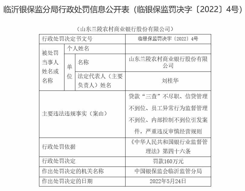 中国经济网北京6月9日讯 中国银保监会网站近日发布的临沂银保监分局行政处罚信息公开表(临银保监罚决字〔2022〕4号)显示,山东兰陵农村商业银行股份有限公司贷款“三查”不尽职、信贷管理不到位、员工异常行为监督管理不到位、内部控制不到位引发案件,严重违反审慎经营规则。临沂银保监分局依据《中华人民共和国银行业监督管理法》第四十六条,对其罚款160万元。