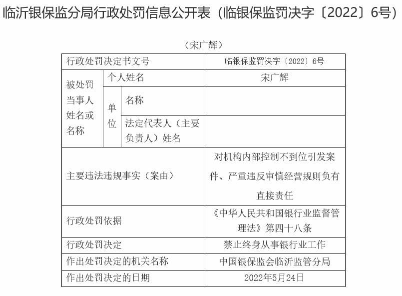 临沂银保监分局行政处罚信息公开表(临银保监罚决字〔2022〕6号)显示,宋广辉对机构内部控制不到位引发案件、严重违反审慎经营规则负有直接责任。临沂银保监分局依据《中华人民共和国银行业监督管理法》第四十八条,对宋广辉禁止终身从事银行业工作。