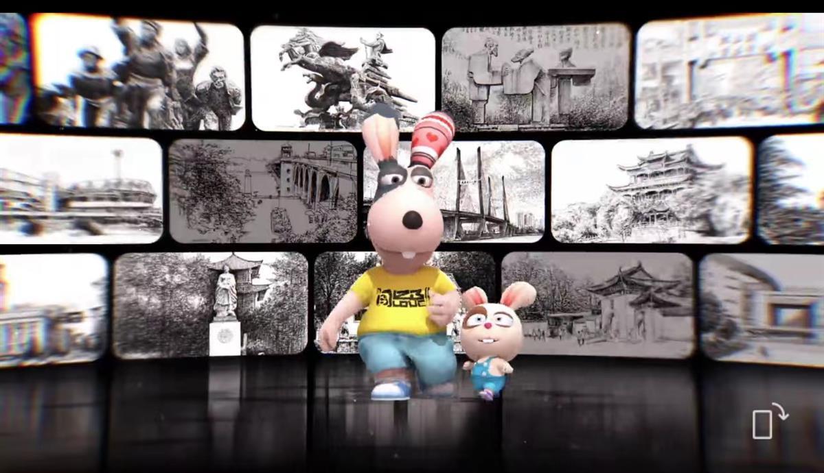 黄鹤楼、长江大桥、寓言公园、行吟阁、古琴台……这些地方,存放着每一个武汉人的回忆。画面伊始,满屏的手绘武汉地标滚动闪烁,用充满“回忆”味道的黑白色调,勾起一串串关于这座城市的珍贵印象。紧接着,MV主角——两只露出大门牙、萌态可掬的兔子亮相。它们白白胖胖的身体上略带黑色的眼圈和星星斑点,一只略壮实高大的兔子身着黄色的圆领衫、头戴爱心袜子,一只矮小些的小兔子身着蓝色背带裤,充满童真。