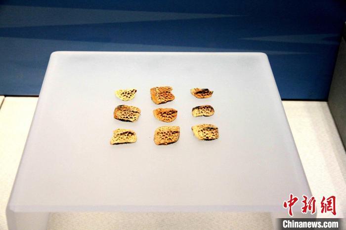 6月10日,山东博物馆内,展出滕州岗上遗址发掘出的鳄鱼骨板。 孙婷婷 摄
