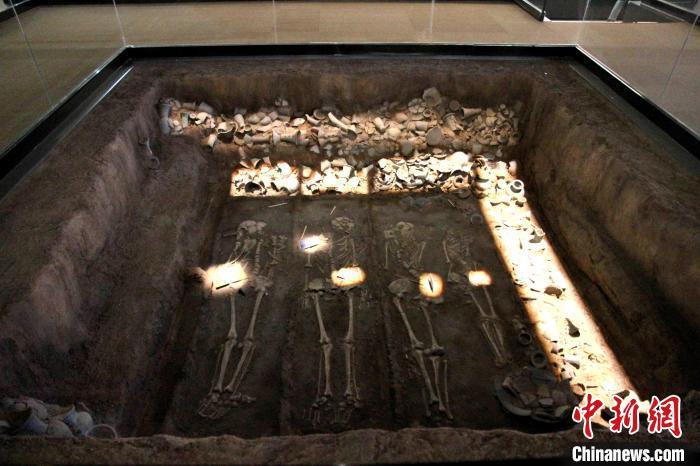 6月10日,山东博物馆内,展出滕州岗上遗址发掘出的四人一次合葬墓。 孙婷婷 摄
