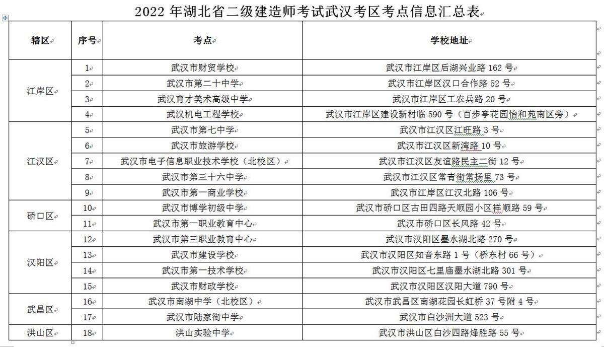 2022年湖北省二级建造师考试武汉考区考点信息汇总表