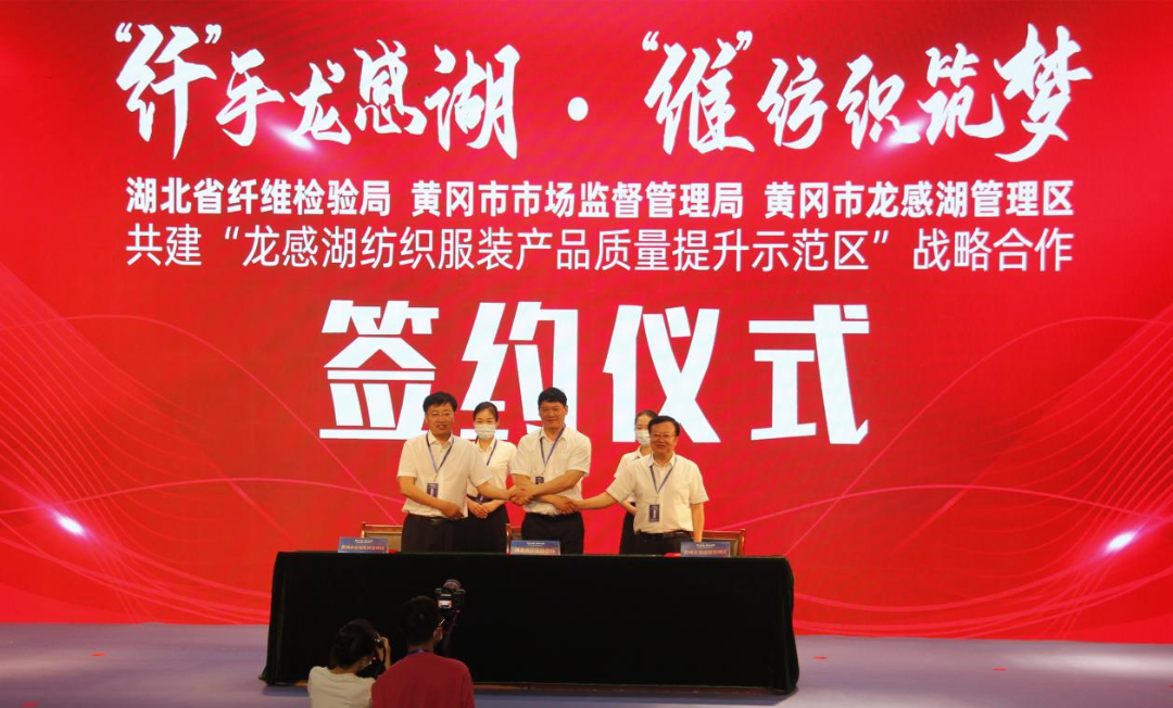 在随后举行的签约仪式上,湖北省纤维检验局党委书记、局长林松金,黄冈市市场监督管理局党组书记、局长余水兵,龙感湖管理区党工委书记高维鹏代表三方共同签署了共建“龙感湖纺织服装产品质量提升示范区”战略合作协议。