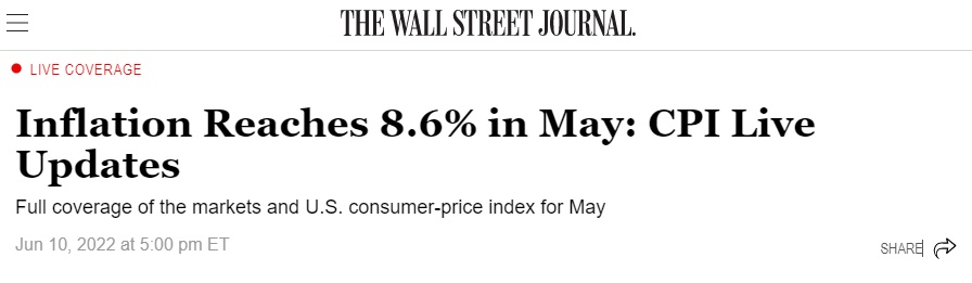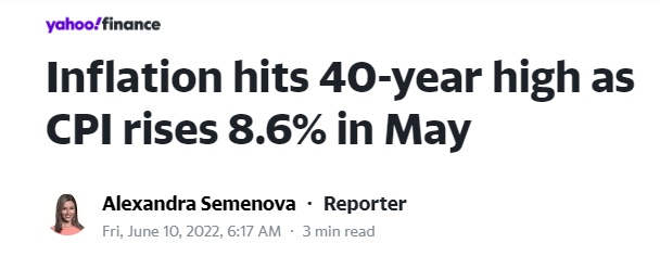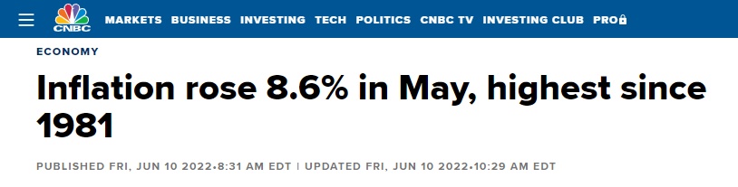 当地时间6月10日,美国劳工部公布的最新数据显示,美国5月消费者价格指数(CPI)环比上涨1%,同比上涨8.6%。5月CPI环比和同比涨幅均较4月明显扩大,同比涨幅再创1981年12月以来最大值。消息一出,立刻霸占了各大美媒头条。