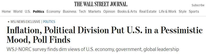 《华尔街日报》与芝加哥大学全国民意研究中心(NORC)进行的一项最新民调结果显示,美国民众对该国经济状况的不满程度创数年来新高。此外,这种悲观情绪还蔓延至对美国政治体制、对美国作为全球领导者的角色和对美国是否有能力帮助民众实现“美国梦”的怀疑。83%的受访者认为美国经济状况“糟糕”或“不太好”,35%的受访者对自身的财务状况不满意。