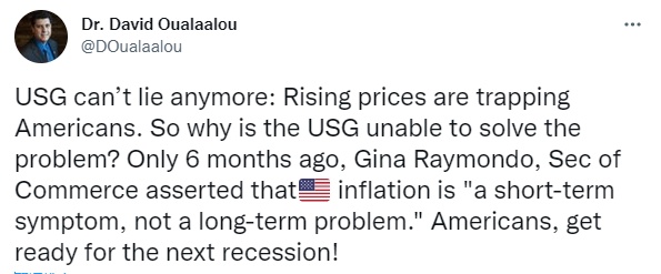 面对通胀数据一路飙升以及政府官员隔靴挠痒的表态,美国学者和专家们怒火中烧。美国地缘政治分析师、作家大卫·奥阿拉鲁10日在社交媒体上发文怒斥,“美国政府无法再撒谎了:不断上涨的物价让美国民众陷入困境。为什么美政府无法解决问题呢?仅仅6个月前,美国商务部长吉娜·雷蒙多还断言,通货膨胀是‘短期症状,不是长期问题’。美国人,请为接下来的经济衰退做好准备吧!”