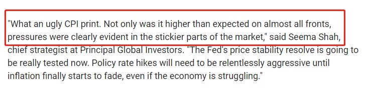 信安环球投资首席策略师希玛沙·沙阿表示,“(最新的)CPI 数据太难看了。几乎在所有方面都超出预期,市场粘性方面的压力也很明显。美联储稳定价格的决心将遭受真正的考验。”