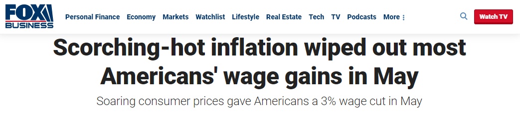 “通货膨胀爆表,抵消了大多数美国人5月份的工资增长。”福克斯商业频道援引信用保险公司Allianz Trade高级经济学家丹·诺斯(Dan North)的话指出,“尽管工资在增加,但远远赶不上通货膨胀飙升的速度,工人们正受到重创。事实上他们正遭到减薪,这无疑会拖累经济。”