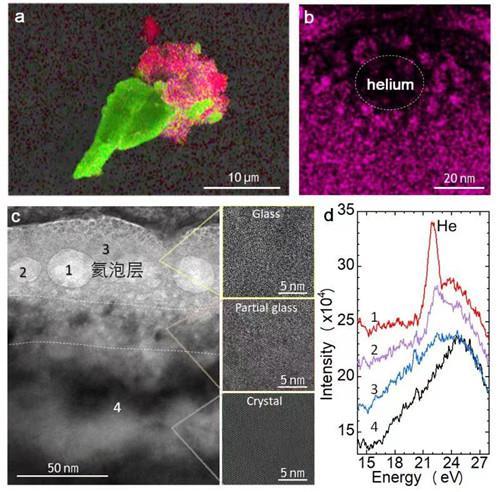 近日,中国科学院宁波材料技术与工程研究所、航天五院钱学森实验室、中国科学院物理研究所和南京大学等联合团队,对嫦娥五号月壤颗粒中的氦原子进行了探测和研究。发现月壤中钛铁矿颗粒表面都存在一层非晶玻璃。研究人员在玻璃层中观测到了大量的氦气泡,直径大约为5~25nm,且大部分气泡都位于玻璃层与晶体的界面附近。而在颗粒内部晶体中,基本没有氦气泡。鉴于氦在钛铁矿中的高溶解度,研究人员认为氦原子首先由太阳风注入钛铁矿晶格中,之后在晶格的沟道扩散效应下,氦会逐渐释放出来。而表层玻璃具有原子无序堆积结构,限制了氦原子的释放,被捕获并逐渐储存起来,形成了气泡。