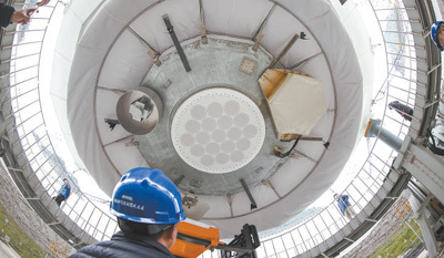 技术人员对“中国天眼”的馈源舱进行维护保养。新华社记者 欧东衢摄