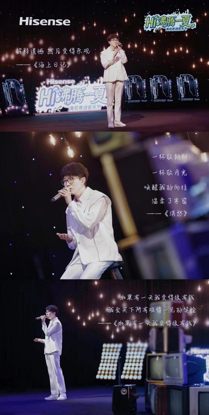 压轴出场的毛不易在长沙现身,先后演唱《如果有一天我变得有钱》、《海上日记》、《消愁》三首脍炙人口的经典歌曲,让观众大饱耳福。毛不易说:“这次他和海信一起尝试做一场特别的演唱会,希望大家可以暂时把压力放下,用心去听、去看、去感受很沸腾的夏日live。”