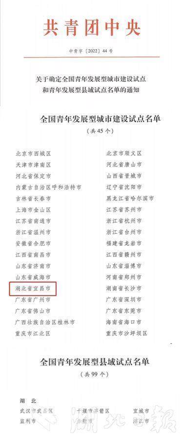 湖北日报讯(通讯员湖小青)近日,按中央宣传部、国家发展改革委、共青团中央等17部门《关于开展青年发展型城市建设试点的意见》部署,全国青年发展型城市(县域)建设试点名单正式发布。湖北省宜昌市入选城市试点,武汉市武昌区、十堰市茅箭区、宜城市、监利市、赤壁市、潜江市等6个县(市、区)入选县域试点,湖北省是此次入选县域试点数量最多的省份。