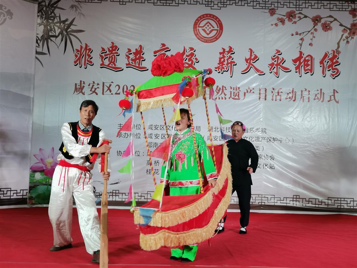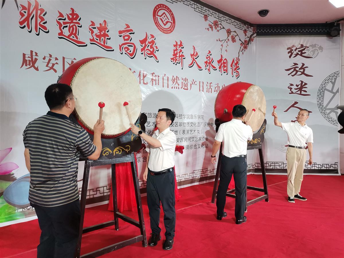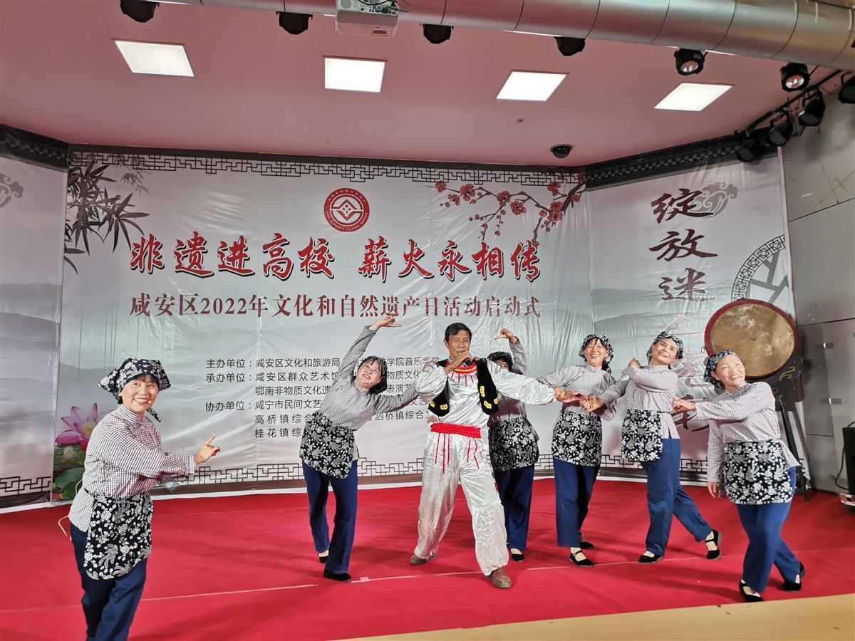 学打鼓、教点钹、唱山歌……千余学生嗨学咸安非遗文化。6月10日,“非遗进高校 薪火永相传”咸宁市咸安区2022年文化和自然遗产日活动,在湖北科技学院咸安校区举行。《汀泗茶歌》、《采莲船、蚌壳精表演》等传统艺术节目,赢得在座师生的阵阵掌声。